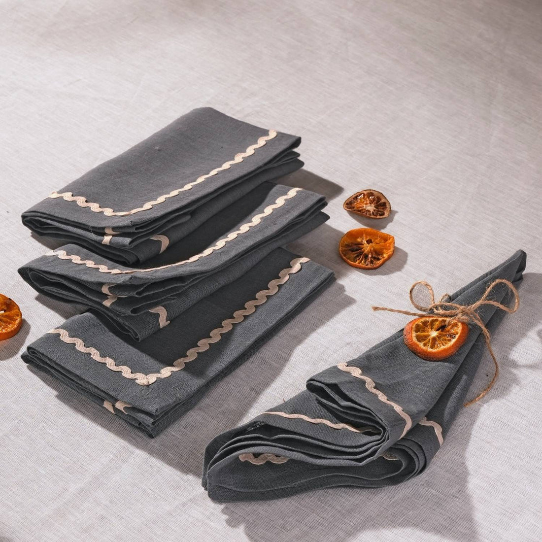 Charcoal Gray Rick Rack Lace 100% Linen Napkins