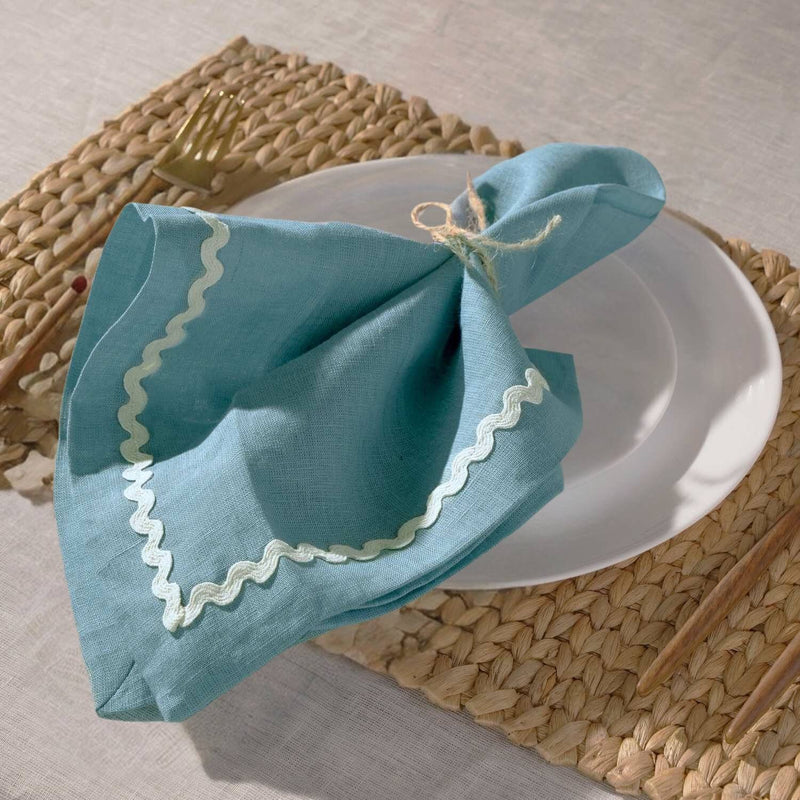 Bring the relaxed essence of coastal living to your table with our dusty blue linen napkins featuring elegant rick rack lace. These breezy pieces infuse your dining area with seaside charm and a touch of vintage whimsy, no ocean view required. The gentle, muted blue tone and playful trim mimic the calming hues of sky and sea, bringing a sense of vacation-like relaxation to your everyday meals.