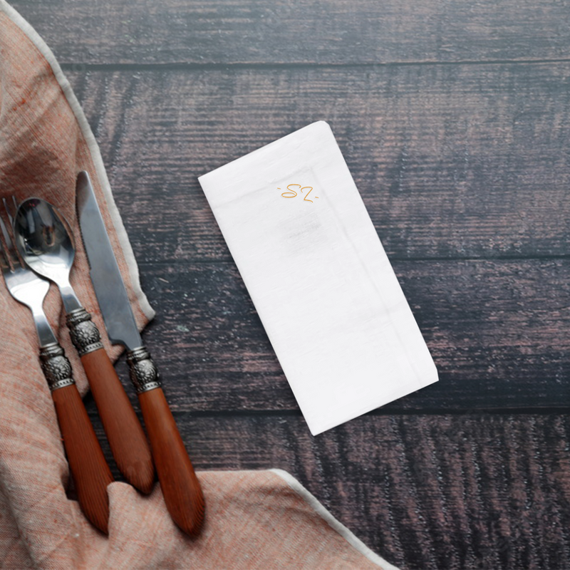 Dive into an immersive dining experience with our premium white linen napkins, personalized with exquisite embroidery to echo your sentiments. Whether it's a couples' initial for intimate dinners, affirmations like "grateful" or "blessed", or endearing terms such as "sweetheart", these napkins resonate with emotion and elegance.