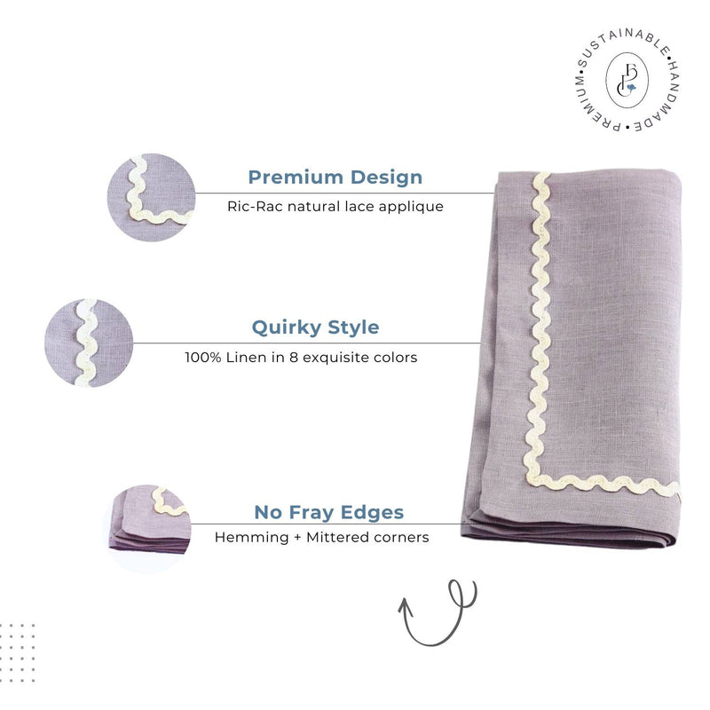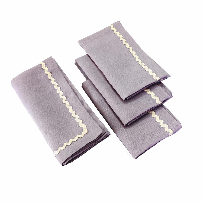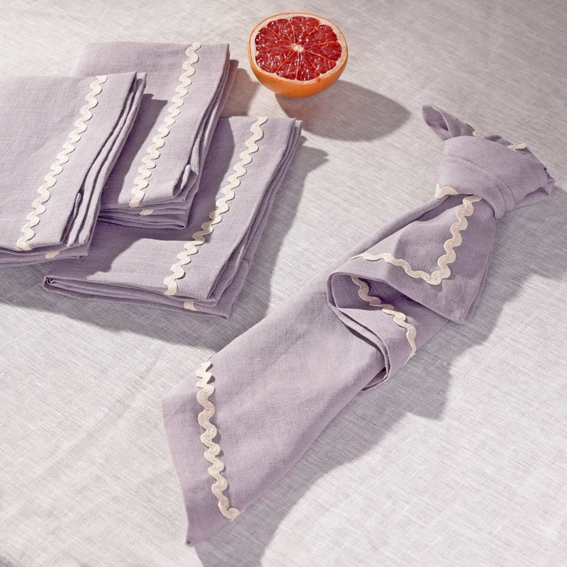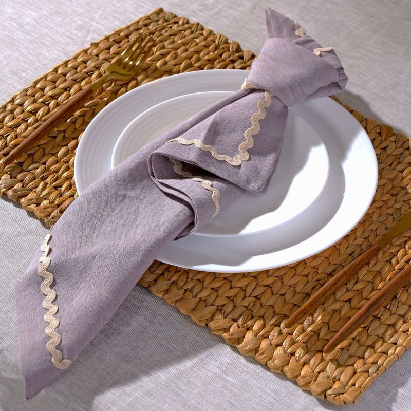 Elevate your table with the dreamy allure of our lavender linen napkins embellished with delicate rick rack lace. These soft, floral-inspired pieces infuse your dining space with subtle romance and vintage charm. Picture the delicate hue and playful trim gracing your table during spring brunches or garden parties, evoking the serenity of blooming fields with a touch of nostalgia.